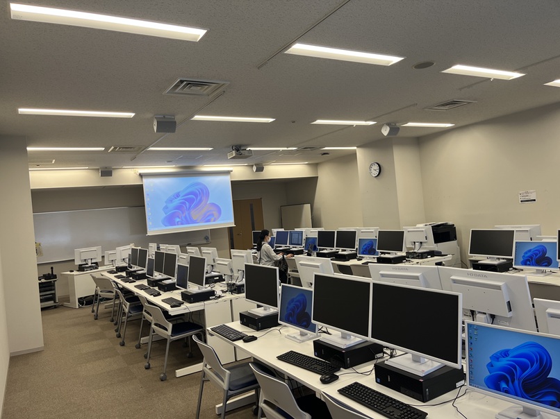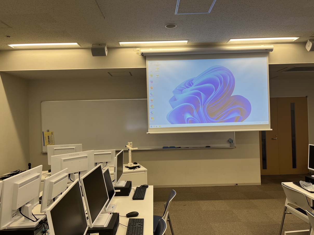 ![]() ![]() 演習室3(天吊りプロジェクター/スクリーン(中央)) |