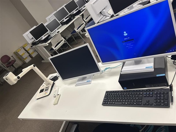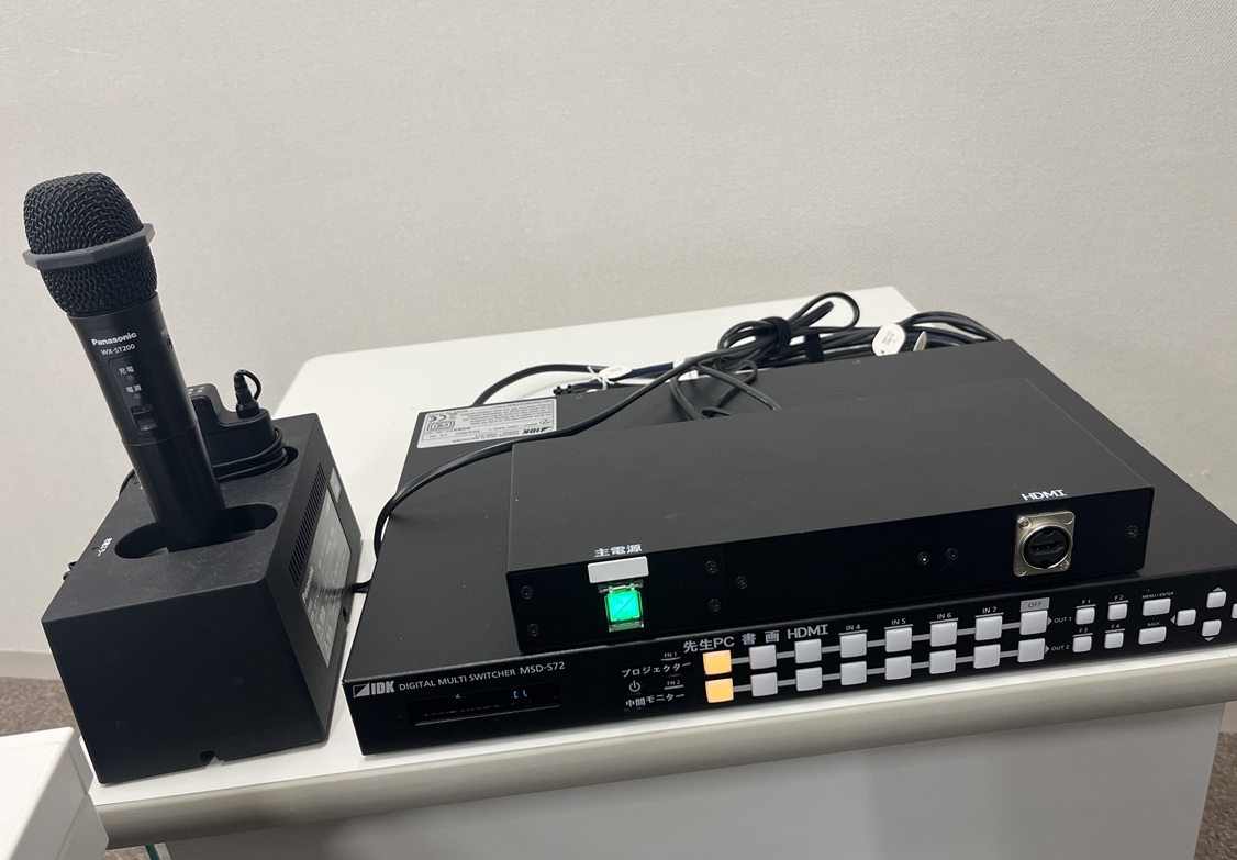 ![]() 教員卓 書画カメラ、教員PC、サブモニター ![]() 教員卓横 マイク(ハンド/ピン) セレクタで教卓・持込・書画カメラを切替。 |